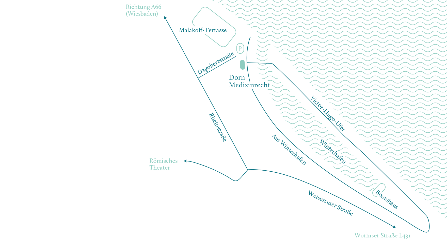 Wenn Sie aus der Tiefgarage des Fort Malakoff Parks kommen, wenden Sie sich Richtung Rhein und halten sich rechts. Die Kanzlei befindet sich in einem sanierten weißen Altbaugebäude, dem so genannten Wasserschlösschen, direkt gegenüber der Eisenbrücke, die auf die Mole führt.