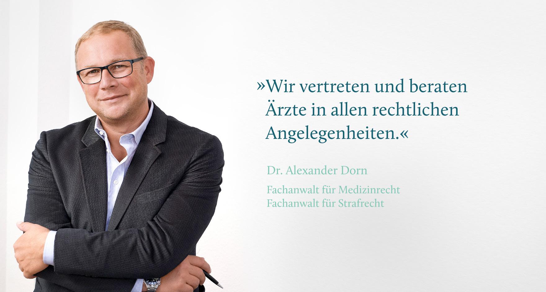 Dr. Alexander Dorn ist Fachanwalt für Medizinrecht und Fachanwalt für Strafrecht. Er ist seit dem Jahr 2000 als Rechtsanwalt zugelassen und seitdem im Medizinrecht tätig.